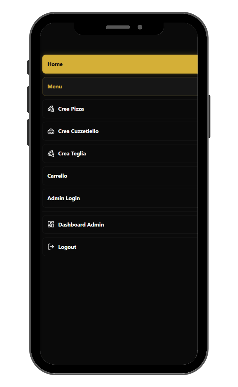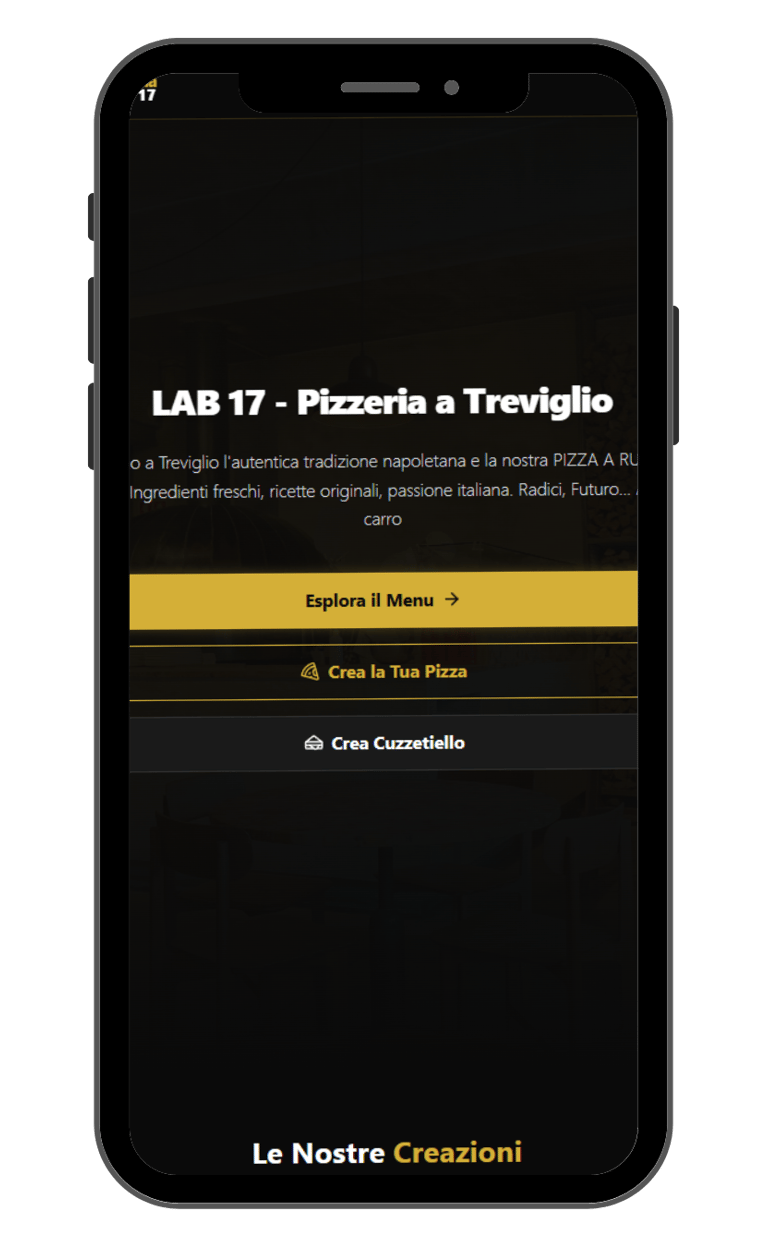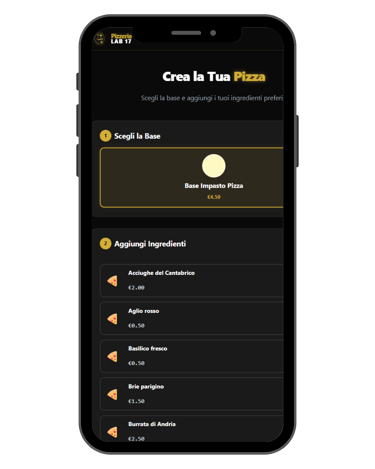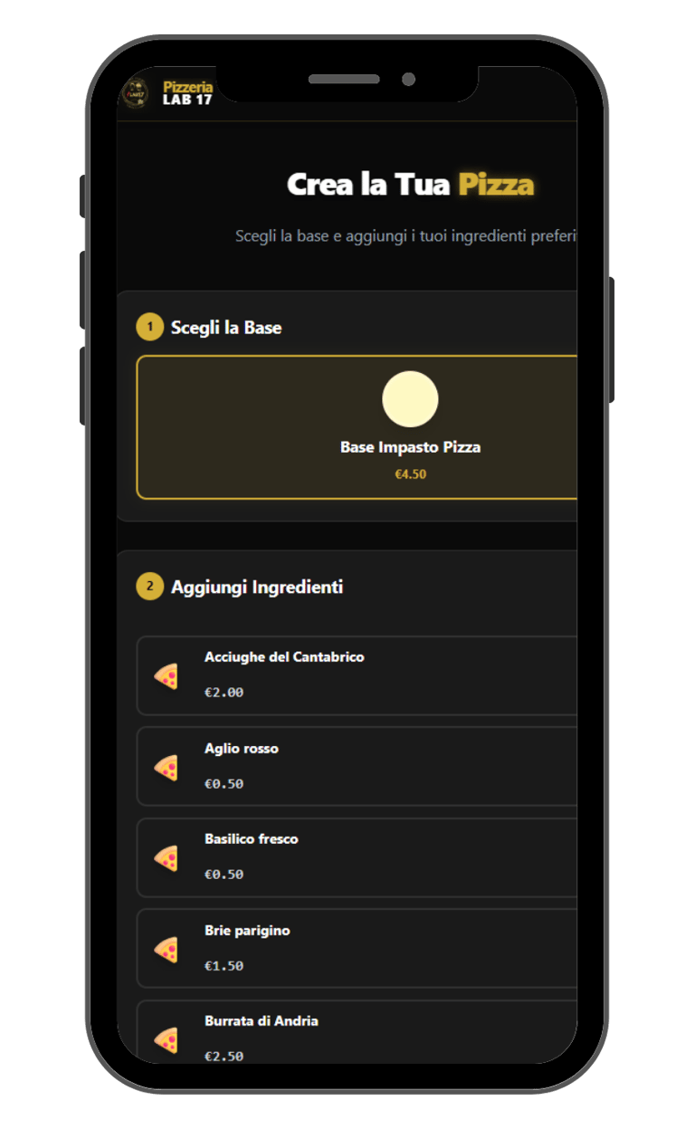 Esperienza Utente su misura: Ho sviluppato un menu visivo intuitivo e un "Pizza Builder" interattivo, permettendo ai clienti di comporre la propria pizza (base, ingredienti, personalizzazioni) con la stessa cura con cui un cuoco prepara un piatto.