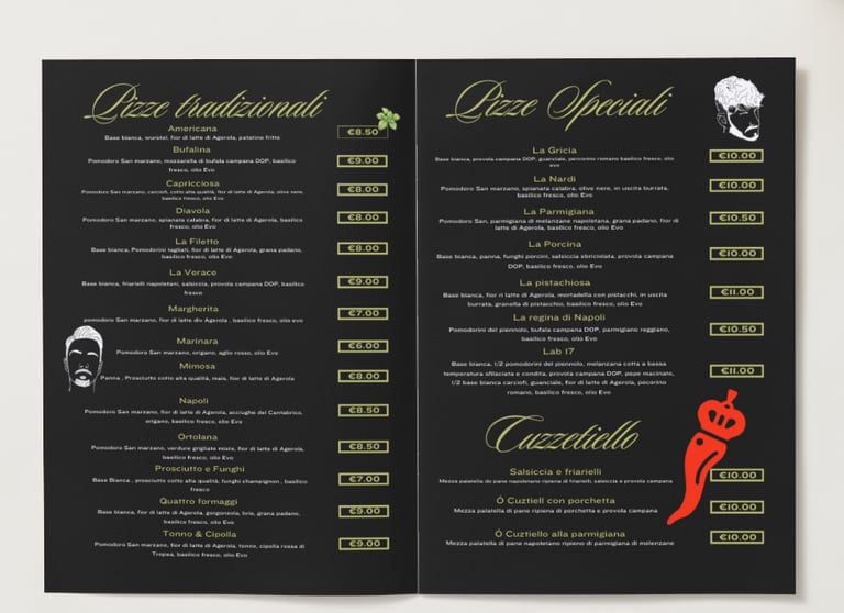 Oltre il digitale: ho curato l'intero layout del menu cartaceo. Ho mantenuto la coerenza visiva scura ed elegante della PWA, organizzando i contenuti (Pizze Tradizionali, Speciali, Cuzzetiello) per facilitare la lettura. Nota l'uso delle illustrazioni personalizzate e del 'cornetto porta-fortuna' rosso, che riprende l'identità visiva.